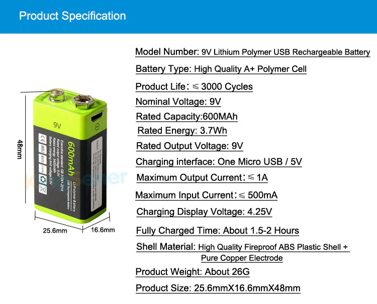 Model Number: 9V Lithium Polymer USB Rechargeable Battery